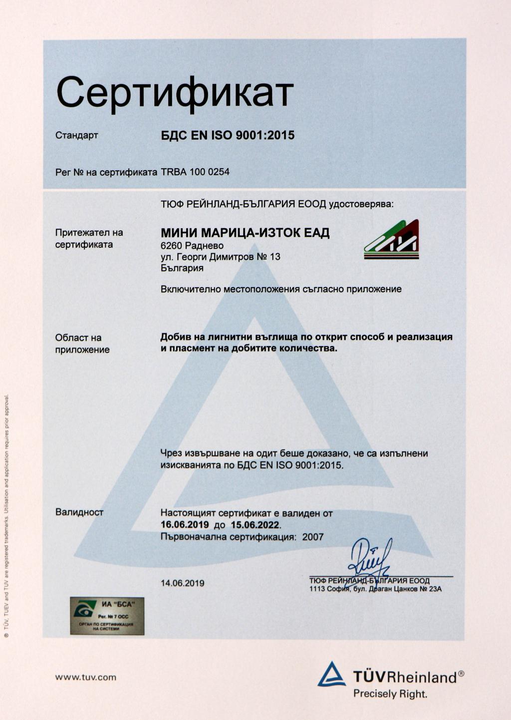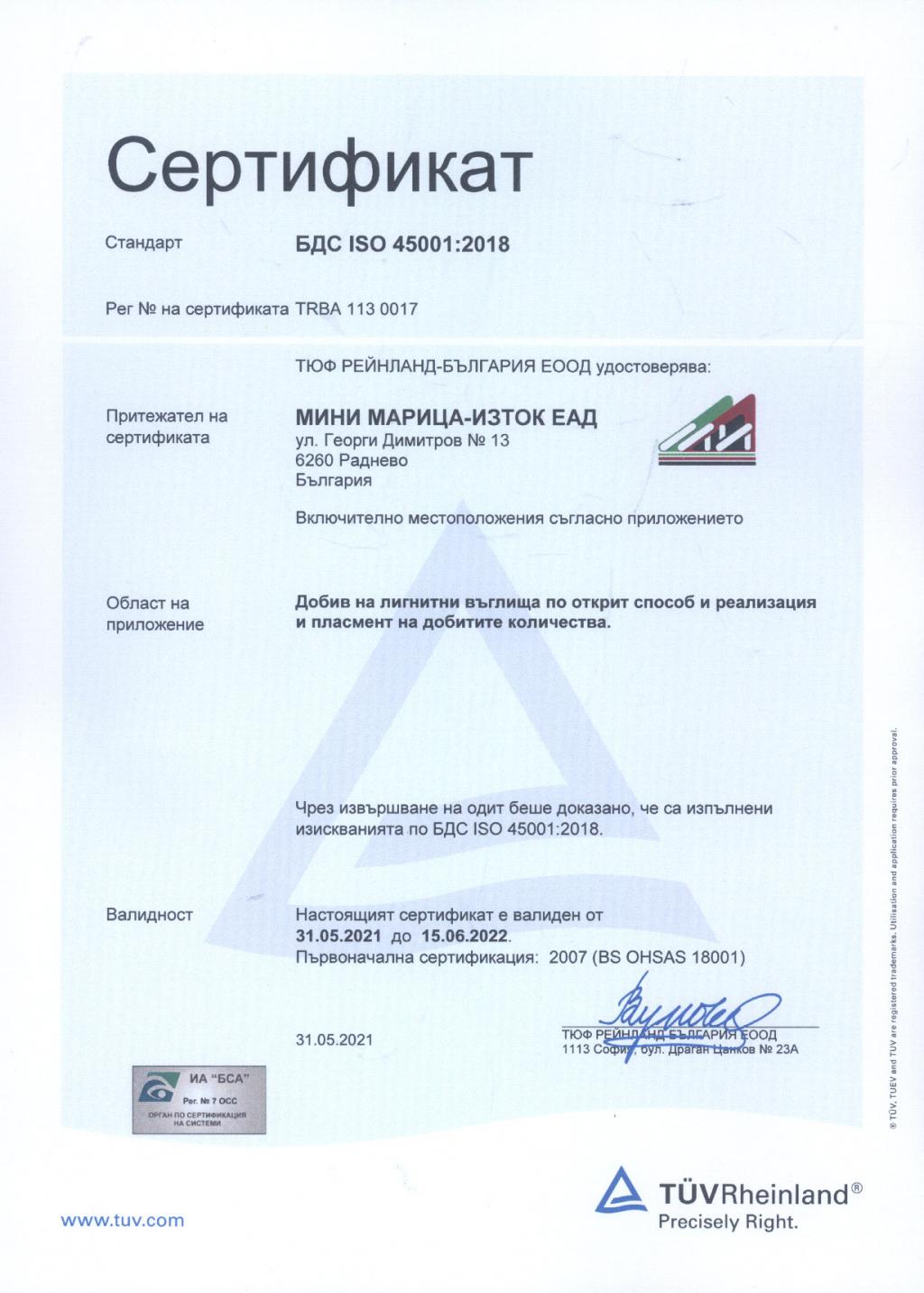 Работата през годините, натрупания опит и добрите практики наложиха трите системи да се интегрират и от април 2009 година влезе в сила Интегрирана система за управление (ИСУ) на качеството, околната среда и здравето и безопасността при работа в съответствие със стандартите ISO 9001, ISO 14001, BS OHSAS 18001. Сертификатите бяха успешно защитени през годините на проведените ресертификационни одити от Органа за сертификация на системи за управление към ТЮФ Рейнланд България ЕООД. Сертификацията е доказателство за успешно положените усилия от страна на ръководството, работниците и служителите на „Мини Марица-изток” ЕАД за повишаване на качеството на предлагания продукт и удовлетворяване на очакванията и нуждите на нашите клиенти. С официалното публикуване на новия стандарт ISO 45001 за здраве и безопасност при работа фирмите имаха тригодишен преходен период до 2021. Според новия стандарт ISO 45001 корпоративното ръководство трябва да поеме отговорността за гарантиране на здравето и безопасността при работа на работниците и служителите.