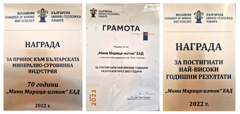 Грамотата и високите отличия бяха връчени на изпълнителния директор на дружеството инж. Илза Чинкова. Това са най-високите отличия на Камарата в областта на добива на подземни богатства и свързаните с това дейности в България. Тези награди за първи път се връчват на дружеството и нареждат най-голямото българско въгледобивно дружество сред най-добрите в минерално-суровинния бранш.